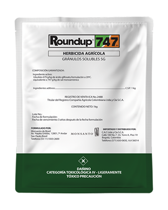 Roundup ® 747 es un herbicida no selectivo, de aplicación post-emergente y acción sistémica. Recomendado para el control de la mayoría de las malezas anuales y perennes, penetra por las hojas y se mueve dentro de las partes aéreas y subterráneas de las plantas causando la muerte total de las malezas. Es una fórmula herbicida como gránulos solubles en agua, los cuales se mezclan fácilmente formando una solución uniforme y estable.